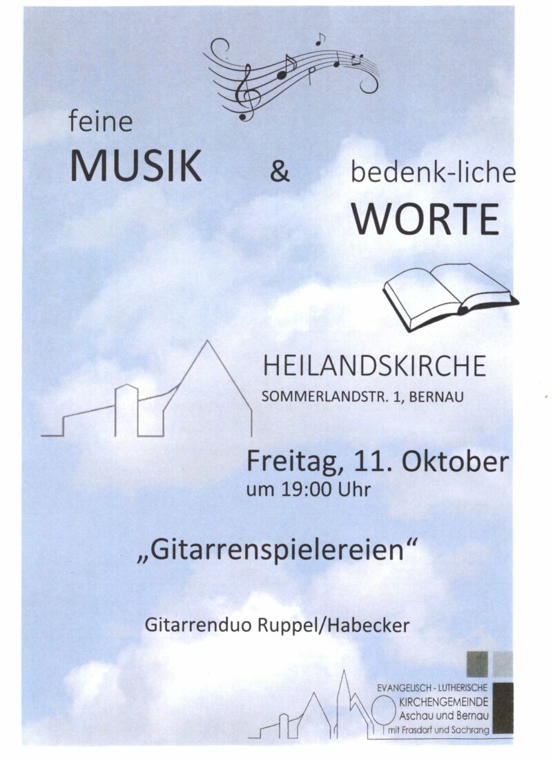 Die Evangelisch-Lutherische Kirchengemeinde Aschau und Bernau mit Frasdorf und Sachrang bieten “Gitarrenspielereien” an. Beginn ist um 19 Uhr mit dem Gitarrenduo Ruppel/Haberecker.