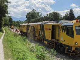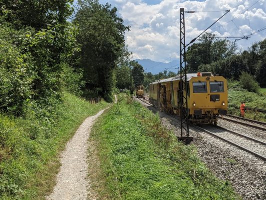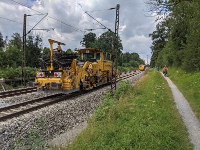 Die Deutsche Bahn erneuert derzeit auf der Strecke zwischen Rosenheim und Freilassing ihre Gleise. Riesige Baumaschinen sind zur Sanierung des Gleisbetts im Einsatz. Dabei werden Schienen, Schwellen, Schotter und das darunter liegende Sand-Kies-Gemisch ausgetauscht. Seit 23. Juli ist der Abschnitt Prien – Übersee dran.