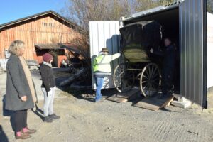 Beim Entladen des „IPM Freezers“: Museumsdirektorin Dr. Julia Schulte to Bühne und Restauratorin Maria Wimmer überwachen das Entladen des IPM Freezers. Aber die Kollegen aus dem Bauhof der Glentleiten haben die Objekte im Griff (im Bild mit gelber Jacke Bauhofleiter Martin Wiedenbauer, rechts Zimmerer Franz Goldhofer). Bildquelle: Bezirk Oberbayern, Archiv FLM Glentleiten, Foto: Bauer.