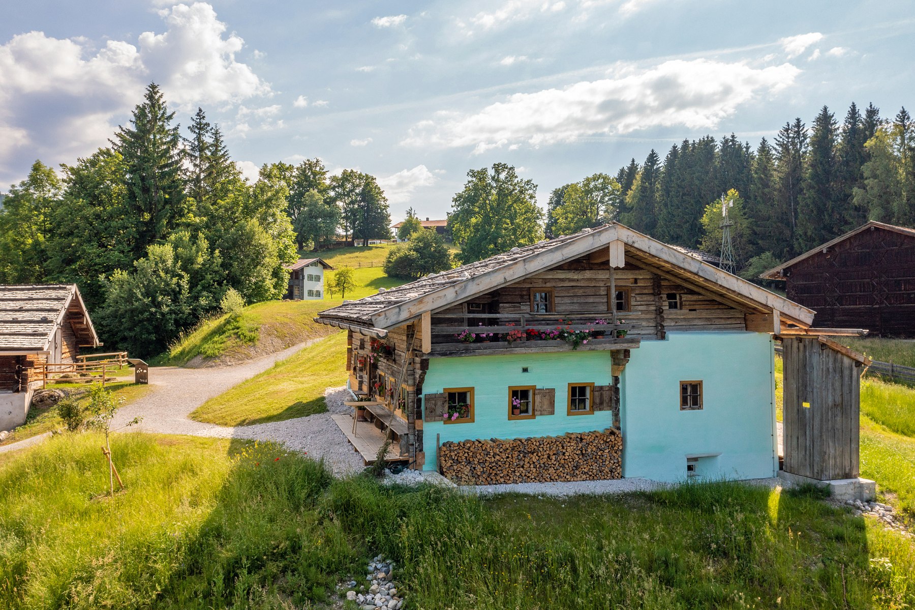 Das Wohnhaus vom Marosen-Lehen an der Glentleiten. Hier bildet es gemeinsam mit weiteren Gebäuden das Ensemble eines Berchtesgadener Zwiehofs. Bildquelle: Bezirk Oberbayern, Archiv FLM Glentleiten, Foto: Amse.