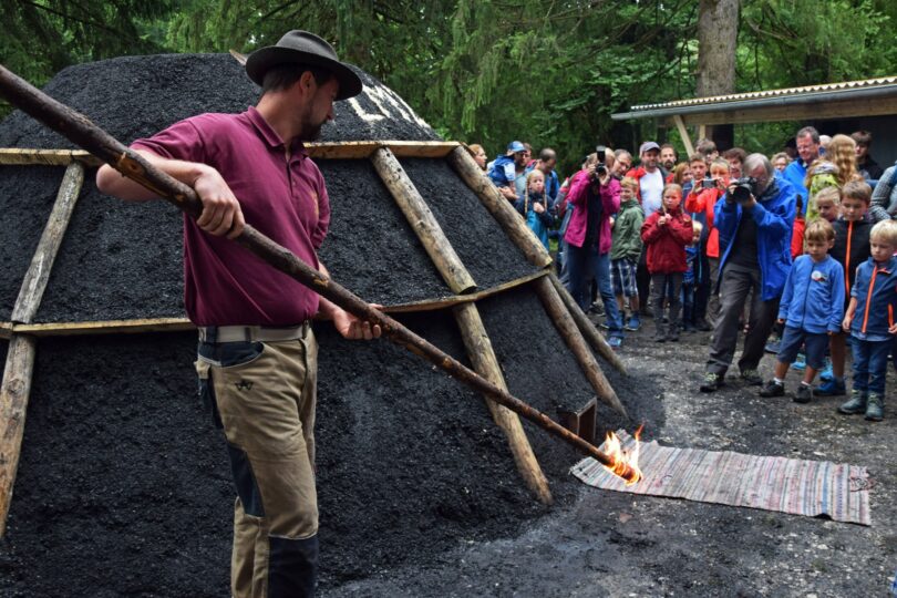 Während der Glentleitner Köhlerwoche qualmt im Freilichtmuseum Glentleiten des Bezirks Oberbayern ein beeindruckender Meiler, den die Köhlerfreunde Bad Kohlgrub betreuen. Ab dem Aufbau des Meilers, der am Freitag, 2. August, beginnt, haben die Besucherinnen und Besucher eine Woche lang die Gelegenheit, die Arbeiten zu verfolgen und sich bis zur Ernte über die einst weit verbreitete Köhlerei zu informieren – die Kohlgruber überwachen den nicht ganz ungefährlichen Prozess der Kohleherstellung Tag und Nacht. Höhepunkt ist das Entzünden des Meilers am 4. August beim Köhlerfest ab 13 Uhr.