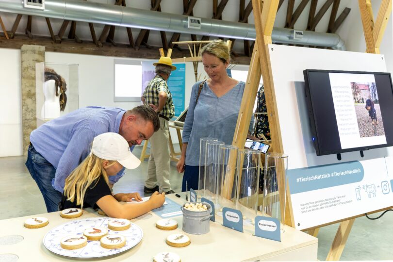 Die Ausstellungstexte liegen neben Deutsch auch auf Englisch und in Leichter Sprache vor. Für Kinder gibt es eine eigene textliche Ebene, die ihnen die Themen leicht verständlich näherbringen, sowie ein Rätselheft, das sie spielerisch mit der Nutztierhaltung vertraut macht. Ihre Fortsetzung findet die Schau im weitläufigen Museumsgelände der Glentleiten. Der Themenweg „Der Mensch und sein Vieh“ lenkt den Blick auf Tierisches in und an den historischen Gebäuden, zum Beispiel auf die Hundehütte, die in den Kornkasten aus Portenläng integriert ist und einen „Kettenhund“ beherbergte, oder auf den Zuchterfolg des Bauern vom Fischerweber-Hof, der sich mit seinem potenten Stier ablichten ließ und das Bild in der guten Stube aufhing.