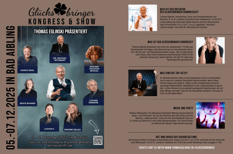 Vom 06.12. bis zum 07.12.25 wird im Bad Aiblinger Kurhaus zum zweiten Mal der Glücksbringer Kongress veranstaltet.
