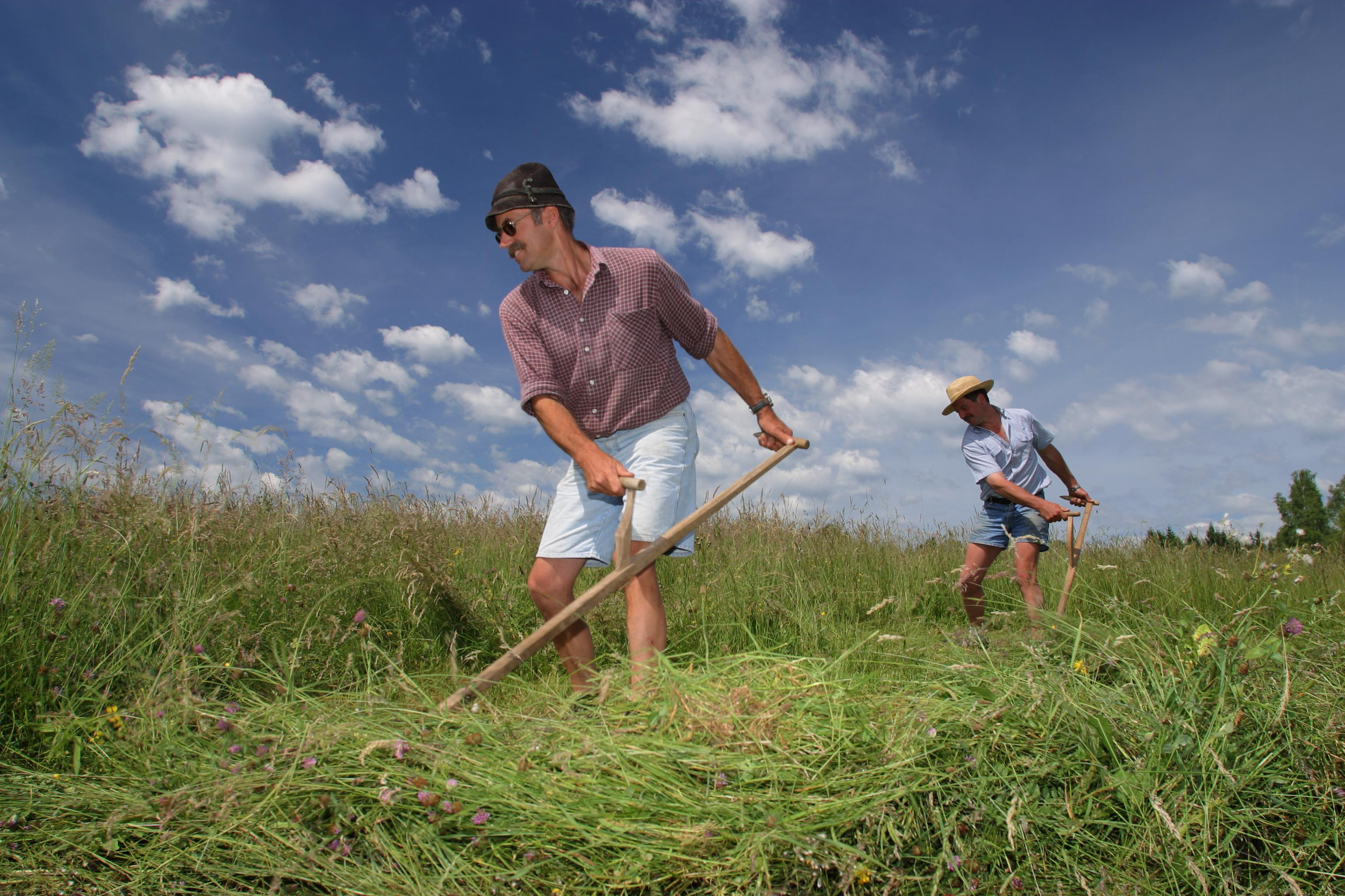 Ein „Klassiker“ – das Mähen mit der Sense gehört selbstverständlich zu den Vorführungen am 30. Juni. Bildquelle: Bezirk Oberbayern, Archiv FLM Glentleiten, Foto: Gerard