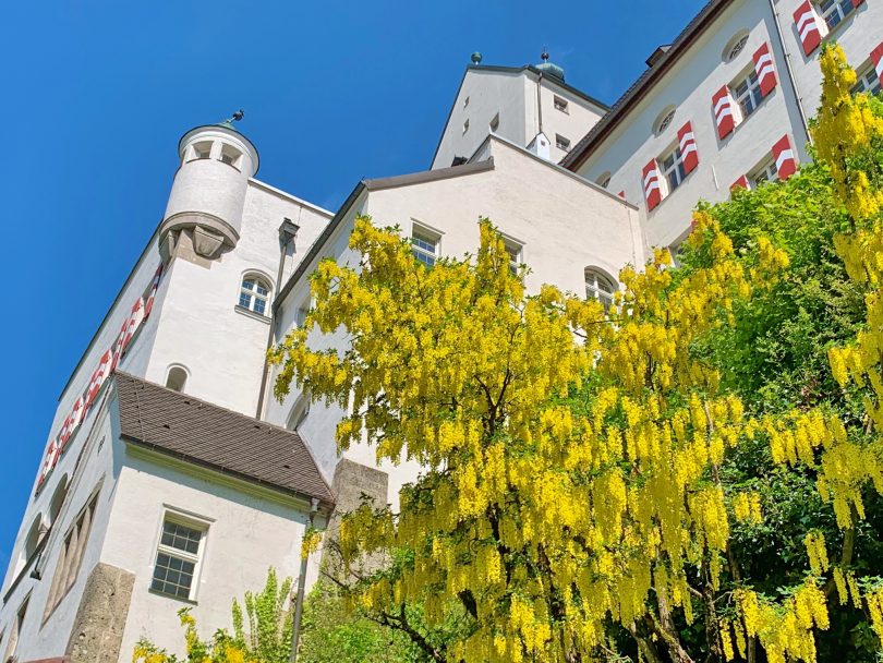 Ein Sprichwort heißt so schön „Es ist nicht alles Gold, was glänzt“ was so viel wie, der äußere Schein trügt, bedeutet. Doch an der imposanten Fassade von Schloss Hohenaschau glänzt derzeit etwas Besonderes und eine leuchtende Blütenpracht wird zur regelrechten Augenweide. Goldgelb blühen Millionen von einzelner Blüten am Goldregen-Baum und geben so ein blühendes Feuerwerk am historischen Gemäuer ab. Die Pflanzengattung des Goldregens, auch Bohnenbaum genannt, bevorzugt als Standort einen kalkhaltigen Trockenrasen und Felsensteppen, also prädestiniert für Hohenaschau. In das Innere des Schlosses geht es für die Öffentlichkeit wieder ab Pfingstsonntag, 31. Mai ab da gibt es wieder das Führungsangebot. Weitere Infos gibt es bei der Tourist Info Aschau i.Chiemgau, Tel. 08052/90490 bzw. unter www.aschau.de.