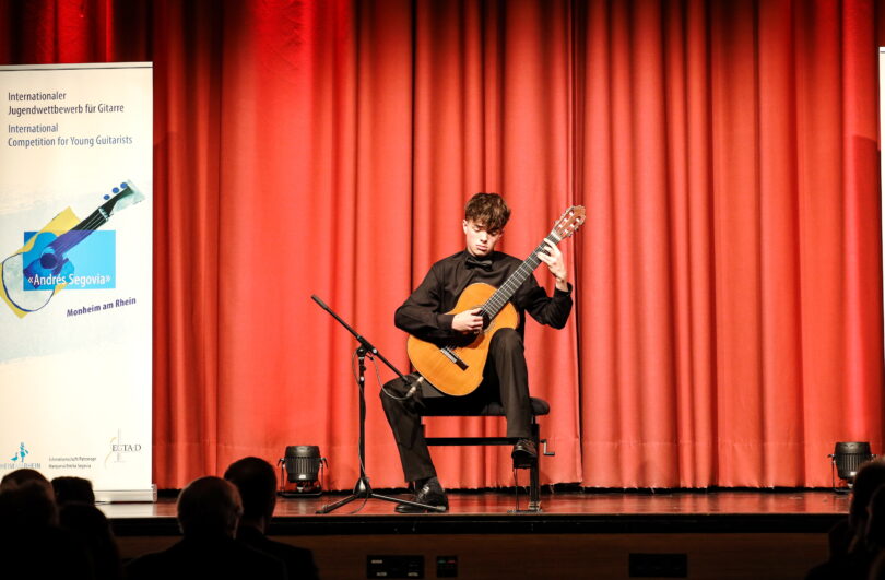 Text: Thomas Kraus – Foto: Mike Günther / Monheimer Kulturwerke – Bildtext: Benno Panhans auf der Bühne beim Internationalen Gitarrenwettbewerb Andrés Segovia in Monheim am Rhein