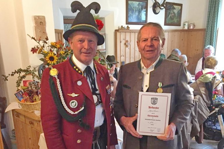 Foto: Hötzelsperger – Fritz Dräxl zeichnete Johann Weyerer zum 80. Geburtstag mit der Goldenen Verdienstmedaille der GSK Samerberg aus.