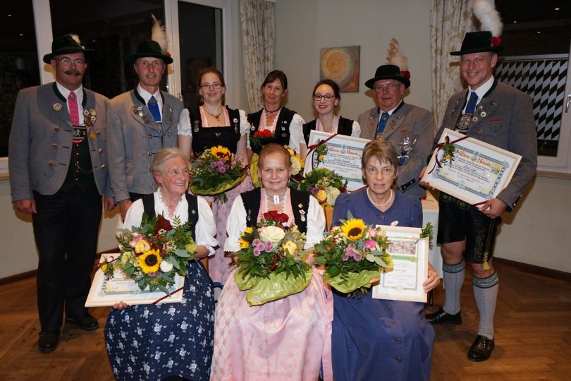 Das „Goldene Vereinszeichen“ heftete Vorstand Licht diesen besonders verdienten und aktiven Mitgliedern an die Tracht: Brauchtumswartin Traudl Schmidmayer, Kassier Konrad Krenzler und Gini Hübl, die das Amt der Inventaristin und Dirndlvertreterin bekleidet. Licht lobte den Einsatz der drei und dankte ihnen mit Blumen und Wein.