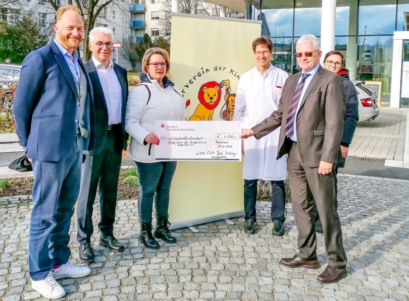 Bericht und Foto: RoMed Kliniken – Einen Spendenscheck über 4.500 Euro aus dem Reinerlös des „Lions Club Bad Aibling-Mangfalltal Golfturniers 2022“ überreichten jetzt dessen Vertreter Präsident Dr. Josef Krapf (2.v.l.) und Bernd Schmitt (2.v.r.) an die Vorsitzende des Fördervereins der Kinderklinik Rosenheim e. V. Mihaela Hammer (3.v.l.) sowie an die 2. Vorsitzende Jasmin Harre-Göhsl (1.v.r.).