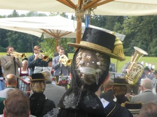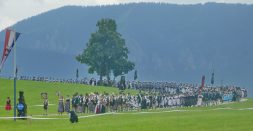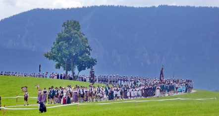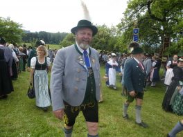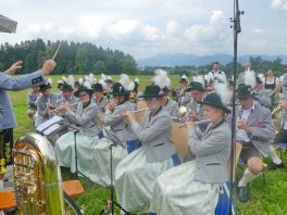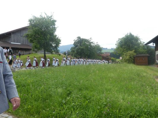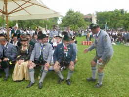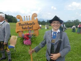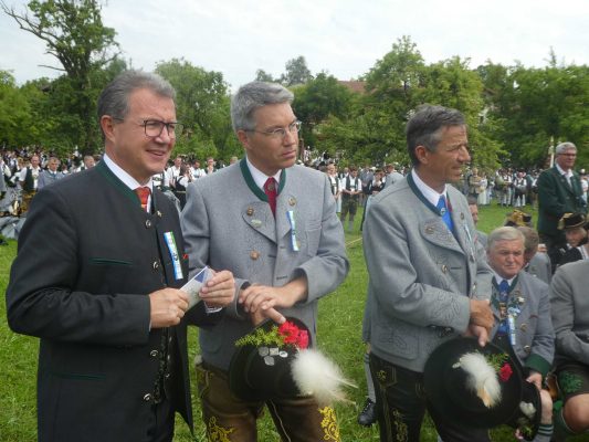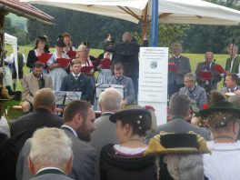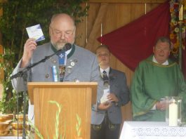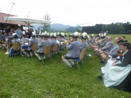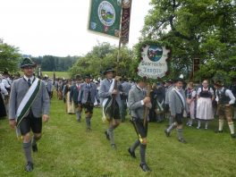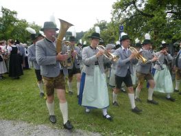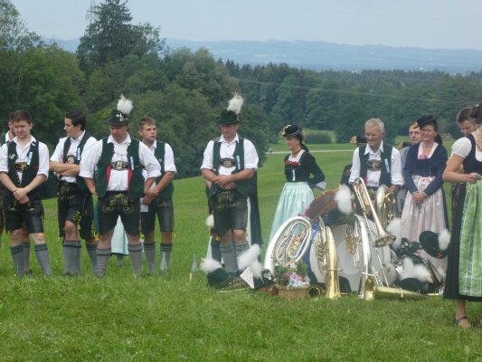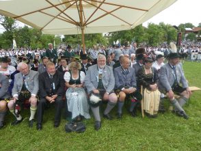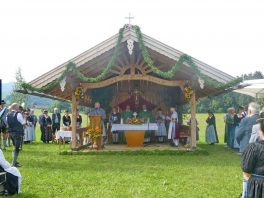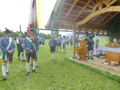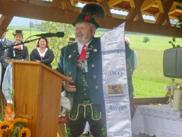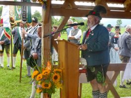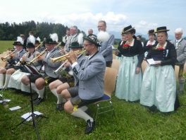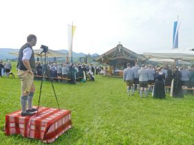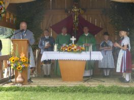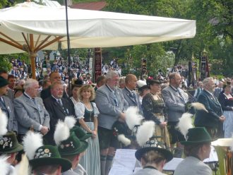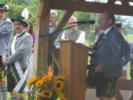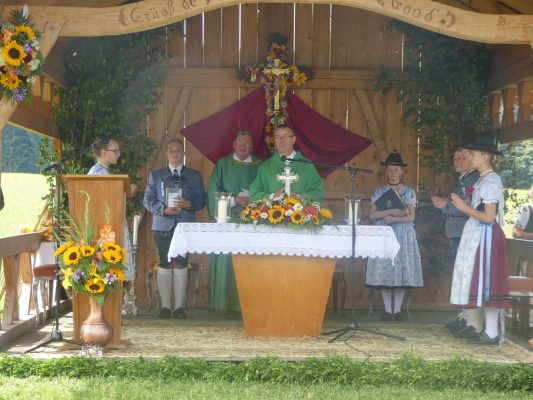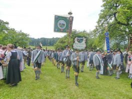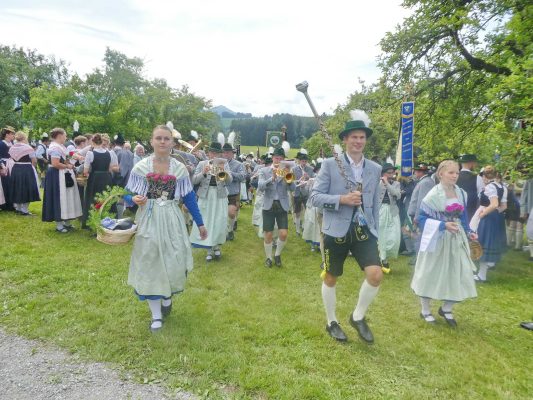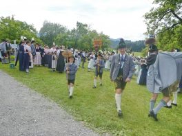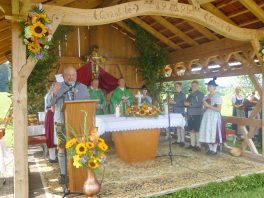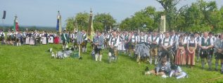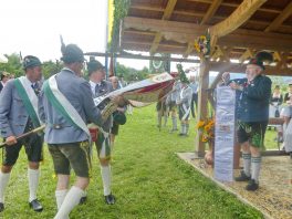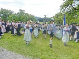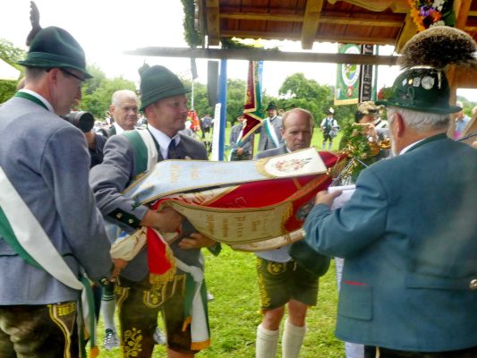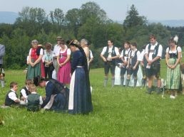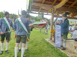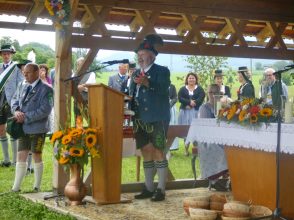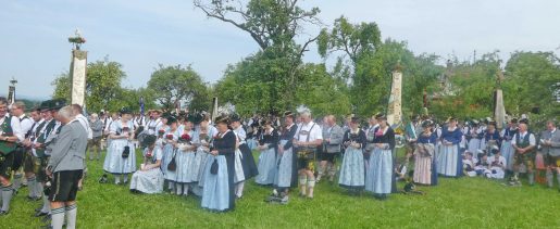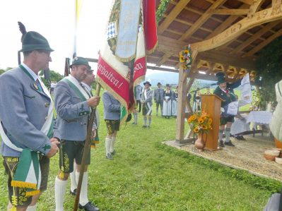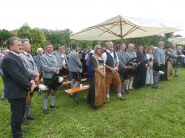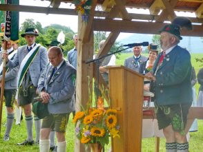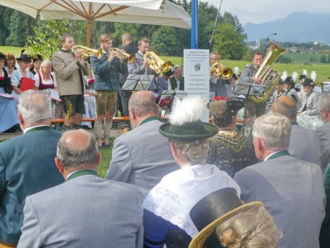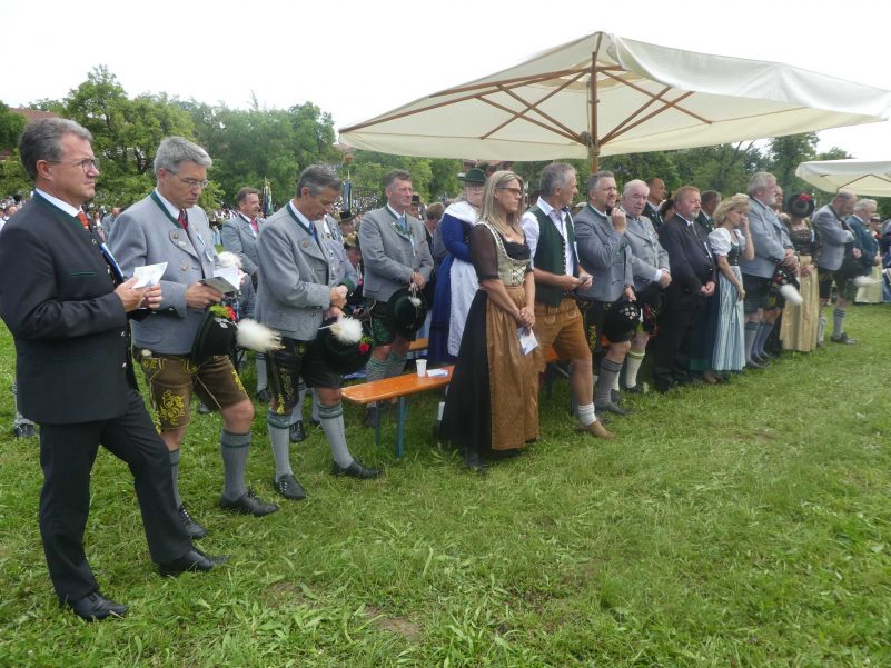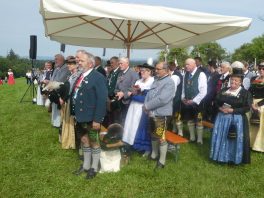Der beschauliche Obstgarten in Schaurain bei Lauterbach in der Gemeinde Rohrdorf war eine herrliche Örtlichkeit für einen Gottesdienst, zu dem der Trachtenverein „D´Lindntaler“ Lauterbach und der Bayerische Inngau-Trachtenverband eingeladen hatten. „Die vor uns liegende Landschaft haben wir vom Herrgott geschenkt bekommen, aber pflegen und erhalten müssen wir sie schon selber. Deshalb appelliere ich an die anwesenden und verantwortungstragenden Politiker, dass sie sich bei der Festlegung für den Brenner-Basis-Tunnel nicht die billigste, sondern die für Menschen und Landschaft am meisten schützende Lösung entscheiden“ – so Gauvorstand Georg Schinnagl bei seiner Begrüßung. Pfarrer Robert Baumgartner verglich das Menschenleben mit einem Motto aus der Senfwerbung: „Süß-sauer wird milde und so werden wir mit fortschreitendem Leben erfahrener und einsichtiger“ sagte der Pfarrer, der den Gottesdienst mit Diakon Anton Zanker zelebrierte. Chorgesang, Bläserweisen und allgemeiner Gesang mit dem neuen Liedheft, das der Bayerische Trachtenverband mit Unterstützung vom Festring München herausgegeben hatte, verhalfen der Feier zu einem besonders festlichen Rahmen. Landesvorsitzender Max Bertl konnte an Vorstand Josef Brem senior ein von Bayerns Ministerpräsidenten Dr. Markus Söder gestiftetes Fahnenband anlässlich des Jubiläums „100 Jahre Freistaat Bayern“ überreichen. Dabei sagte Max Bertl: „Vor 135 Jahren hat Lehrer Joseph Vogl in Bayerischzell den ersten bayerischen Trachtenverein ausgerufen, heute sehen wir, zu welcher Pracht dieser Aufruf geführt hat“.