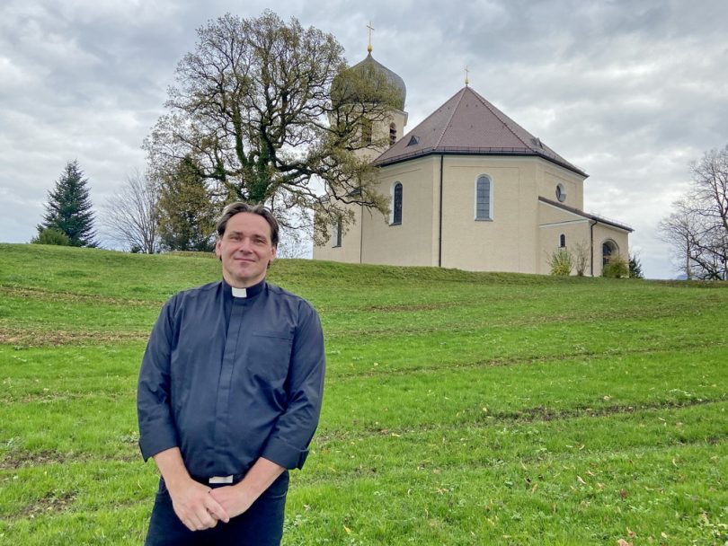 Unsere Aufnahme zeigt Pfarrer Gottfried Grengel mit der Pfarrkirche „Christkönig“ von Wildenwart, dort feierte er mit den Christen die Feste Allerheiligen und Allerseelen.