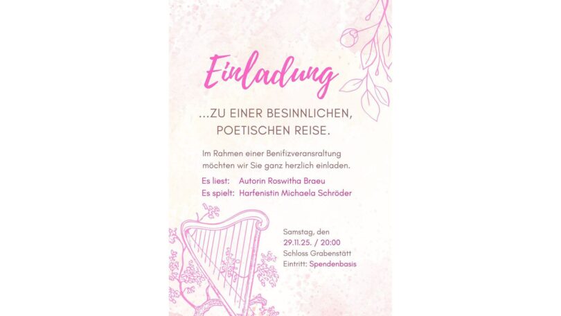 Im Schloss Grabenstätt findet am Samstag, 29. November 2025, um 20 Uhr eine Benefizveranstaltung mit Lesung und Harfenmusik statt.
