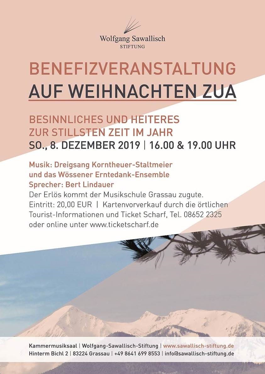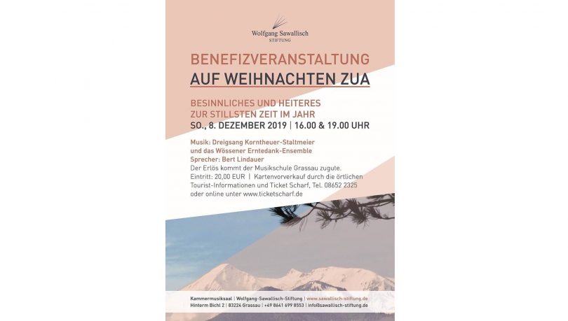Zu der musikalischen Benefizveranstaltung “Auf Weihnachten zua” im Kammermusiksaal in Grassau lädt die Wolfgang Sawallisch-Stiftung am Sonntag, den 8. Dezember 2019, herzlich ein. Um 16 Uhr sowie um 19 Uhr spielen der Dreigsang Korntheuer-Staltmeier und das Wössner Erntedank-Ensemble besinnliche und heitere Stücke für den guten Zweck, der Erlös kommt der Musikschule Grassau zugute.