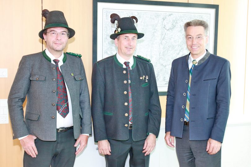 Der Schützengau Rosenheim feiert in diesem Jahr sein 100-jähriges Bestehen. Der 1. Gauschützenmeister Gerhard Nevihosteny (Mitte) und der stellvertretende Gauschützenmeister Franz Kiesmüller (links) luden Landrat Otto Lederer zum offiziellen Festakt am 3. Dezember ein. Ein Thema im Gespräch war unter anderem die Folgen der Corona-Pandemie auf das Ehrenamt. Auch in den Schützenvereinen gibt es Probleme, genügend Ehrenamtliche für eine Mitarbeit zu begeistern. Der Schützengau Rosenheim umfasst rund 7.400 Mitglieder in 80 Vereinen. Prominentestes Mitglied derzeit ist die Bogenschützin Katharina Bauer aus Raubling, die sich längst in der Weltspitze etabliert hat.