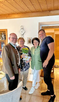 Foto: Gratulation für Hanni Jell – von links: Zweiter Bürgermeister Michael Anner junior, Hanni Jell, Rosi Hell und Pfarrvikar Gottfried Grengel