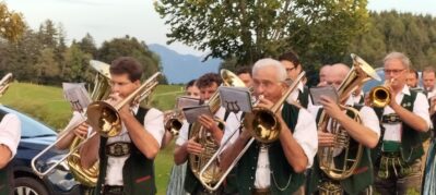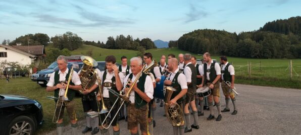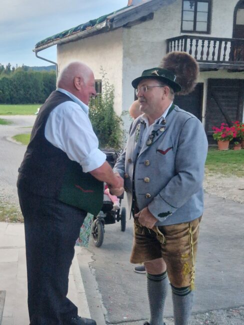 Besonders guten Grund zum Gratulieren und Danken hatte der Trachtenverein „Daxenwinkler“ Atzing, diesem gehörte der Jubilar seit der Gründung einer Kindergruppe im Jahr 1956 an. Neun Jahre war Paul Schlosser Erster Vorplattler und 14 Jahre bis 1984 führte er den Verein als Erster Vorstand, zudem war er beim Gautrachtenfest 1987 Festleiter. Daran erinnerten bei der Übergabe eines Geschenkkorbes die nunmehrigen Atzinger Trachtenvorstände Michael Schlosser und Konrad Huber. Seit vielen Jahren gehört Paul Schlosser auch dem Trachtenverein „Die lustigen Wildenwarter“ an. Bei diesem ist es guter und schöner Brauch, dass bei einem 80. Geburtstag mit einem Ständchen der Wildenwarter Blaskapelle gratuliert wird. Und so marschierte Trachtenvorstand Peter Voggenauer mit einer starken Besetzung der Blaskapelle vom Stettener Ortseingang zum Huberhof. Natürlich gab es dort für die Musikanten eine Brotzeit, ehe sich diese zu ihrer wöchentlichen Probe ins Musikantenheim begaben.