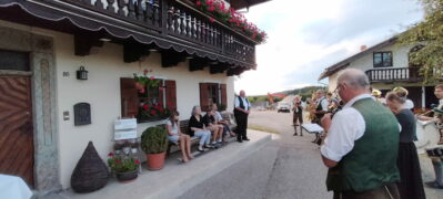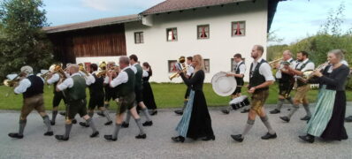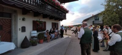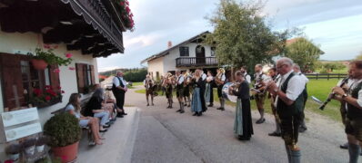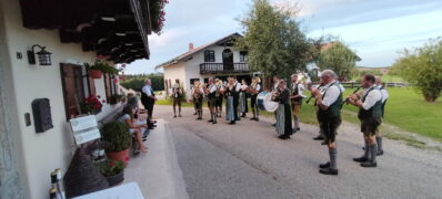 Fotos: Blaskapelle/GTEV Wildenwart – 2.Wildenwarter Blasmusikanten und Wildenwarts Trachtenvorstand Peter Voggenauer gratulierten mit einem Ständchen vor dem Huberhof .