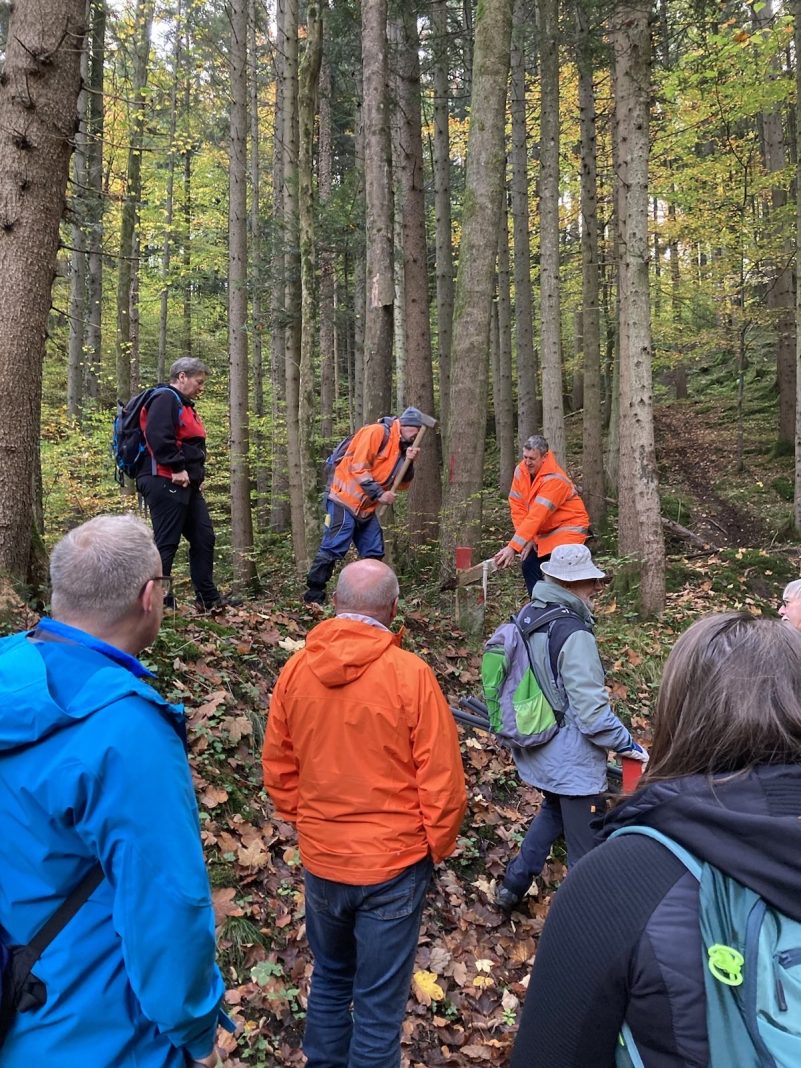 Diese Begehung findet nur etwa alle 20 Jahre statt. Mit von der Partie waren neben den beiden Liegenschaftsvertretern aus Bruckmühl und Bad Aibling, Markus Zehetmaier und Anna-Maria Rittner, Falk Brem vom Vermessungsamt, Feldgeschworene und Jäger dabei. Bruckmühls Bürgermeister Richard Richter und Bad Aiblings Amtskollege Stephan Schlier stießen ebenfalls zur Runde. „Man sieht wie teils im Zickzack die Grenzen zwischen Bad Aibling und Bruckmühl verlaufen. Seit Jahrhunderten bestehen sie“, beschreibt Zehetmaier. Zusammen mit Rittner setzen die beiden auf ein gutes kommunales Miteinander und kurze Wege für Absprachen. Gemeinsam werden bei der Begehung Markierungen und Grenzsteine kontrolliert, Grenzen und deren Markierungen gesucht und gegebenenfalls Grenzpfosten aus Eichenholz erneuert sowie der Zustand des Waldes und der Flure erörtert. Umfassende Informationen über das Gemeindegebiet erhielten die Teilnehmer. Dies war erst der Auftakt. In den kommenden Jahren werden die Bruckmühler Gemeindegrenzen dann mit Vertretern aus Tuntenhausen, Baiern sowie dann Feldkirchen-Westerham und Irschenberg abgegangen. „Jedes Jahr soll ein Teilgebiet unter die Lupe genommen werden“, so Falk Brem vom Vermessungsamt. Er begrüßt diese Form der Begehung sehr. Ermögliche es doch genaue und tiefe Einblicke, ob Kartierungen stimmen und wie tatsächlich die Grenzverlauf-Situation ist. Über Ackerflächen, Asphaltstraßen, Forstwege, durch den Wald sowie durch Bäche und über Stock und Stein verlief die Strecke zuerst ins östliche Gebiet von Bruckmühl. Von Irschenberg über den Weiler „Westen“, Abel und Mainz vorbei ging es über Unterstaudhausen und Weiden gen Heufeld und von dort weiter bis nach Mietraching und Oberadlfurt. Dort stoßen die drei Gemeindegrenzen von Bruckmühl, Tuntenhausen und Bad Aibling aufeinander. Die Infrastruktur hatten die Teilnehmer dabei genau im Blick wie das Setzen neuer Grenzpfosten. „Manche waren nachzubessern und andere schlichtweg zu ersetzen“, so Zehetmaier. Rittner betont, dass es eine gute Gelegenheit ist, die Grenzen im Detail sowie die Örtlichkeiten in Augenschein zu nehmen: „Normalerweise kommt man an diese Flecken im Wald ja nicht hin.“ Bemerkenswert bei der Begehung waren unter anderem: eine ausgeprägte Bergwanderung mit steilen Abhängen sowie über Gräben und Bachläufe; ein außergewöhnlich großer Dachsberg, der laut Jägern über Jahrzehnte gebaut worden sein muss sowie über 100 Jahre alte Eichen und Buchen am Waldrand.