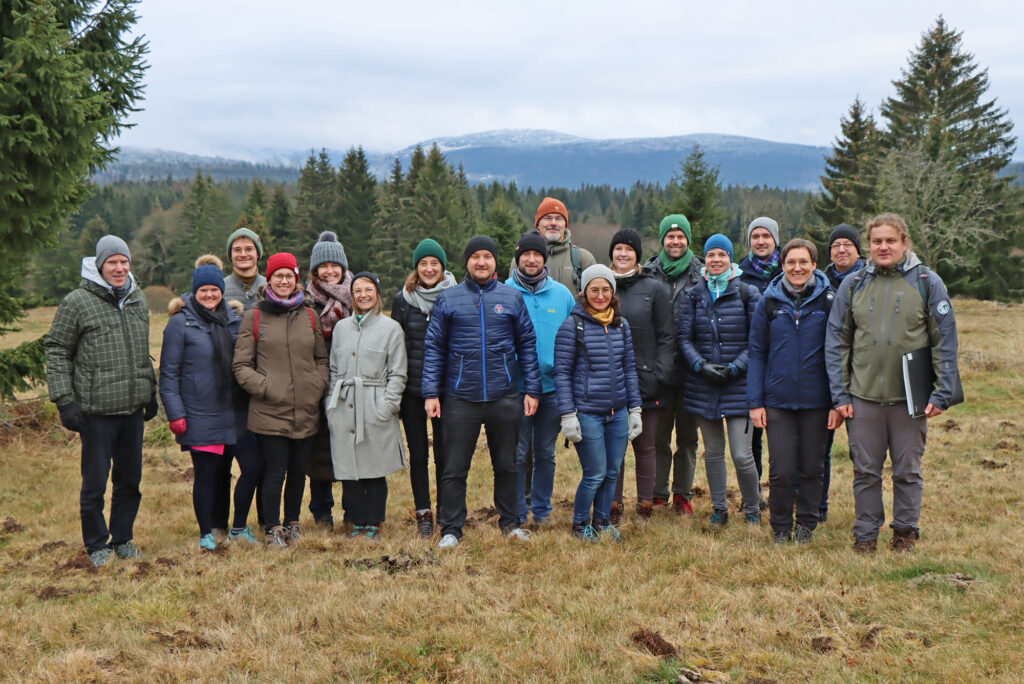 Nach einem einwöchigen, zum Großteil in Tschechien stattfindenden Fortbildungsprogramm machte die Gruppe bei der Heimreise nach München noch Station im Bayerwald. In der Nationalparkinfo Mauth führte Ursula Schuster ins Thema ein. Nach dem Vortrag ging’s schließlich raus in die Natur. Am Grenzübergang Bučina empfing Martin Starý die Gruppe für eine vier Kilometer lange Wanderung. Dabei konnten die Gäste nicht nur die besondere Landschaft der Wiesen südlich von Bučina (Buchwald) bewundern, sondern auch Einblicke ins neueste Erweiterungsgebiet des Nationalparks Bayerischer Wald rund um die Teufelsbachklause sammeln.