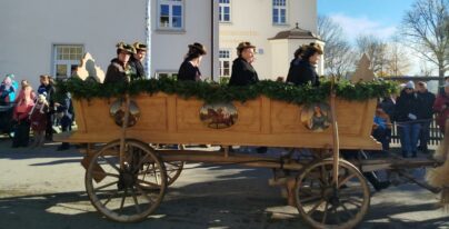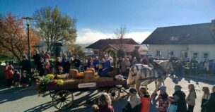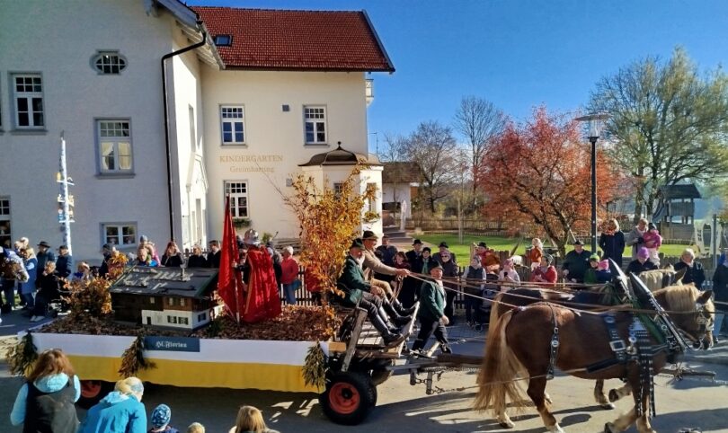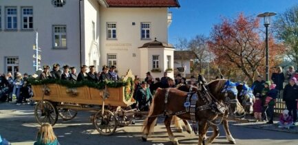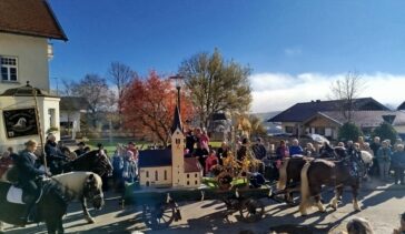 Traditionell immer am 6. November, dem Tag des hl. Leonhard, findet in dem schmucken Dorf Greimharting der Leonhardiritt statt. Und gerne haben wir vom Trachtenverein Griesstätt wieder daran teilgenommen, ist der dortige Trachtenverein „Ratzingerhöh“ doch unser Patenverein und so pflegen wir schon eine lange, freundschaftliche Beziehung zu den Greimhartingern. Mehr und mehr verzog sich der kalte Nebel und in Greimharting kam dann der blaue Himmel und die wärmende Sonne zum Vorschein. Seit über 600 Jahren gibt es in Greimharting diesen Leonhardiritt und wie es sich gehört, begann dieser für die Greimhartinger ganz besondere Tag um 9 Uhr mit einem Gottesdienst. In seiner Predigt erinnerte Pfarrer Philipp Werner an den Heiligen Leonhard. „Der Heilige Leonhard ist gerade mit seinen Attributen Gefangenschaft und Ketten ein Sinnbild auch in heutiger Zeit, wenn wir bedenken, dass wir uns von Egoismus, Sucht oder unguten Gewohnheiten befreien wollen“. Nach dem Gottesdienst in der Kirche gings dreimal am Pfarrer vorbei, der am Kirchenhügel die Segnung aller am Umritt beteiligten vornahm. Rund 90 festlich herausgeputzte Rösser, stolze Reiter und prächtige Motiv- und Leutewagen haben teilgenommen und gaben ein wunderschönes Bild auch für die vielen Zuschauer ab. Heilige, voran die Gottesmutter Maria mit dem ausgebreiteten Schutzmantel sowie der hl. Florian, der hl. Isidor, der hl. Ambrosius, der hl. Wendelin, des Weiteren Kirchen und Kapellen und landwirtschaftliche Symbole prägten diese Festwägen. Hier waren auch unsere feschen Griesstätter Röckefrauen dabei, wieder mit dem schön bemalten Motivwagen, gezogen von zwei prächtigen Rössern.