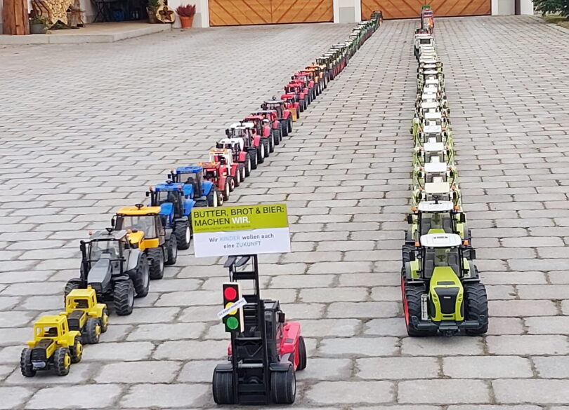 Mit der Aufstellung der Mini-Traktoren wird bereits eine Vorahnung auf die geplanten Bauern-Demonstrationen am 8. Januar vermittelt.