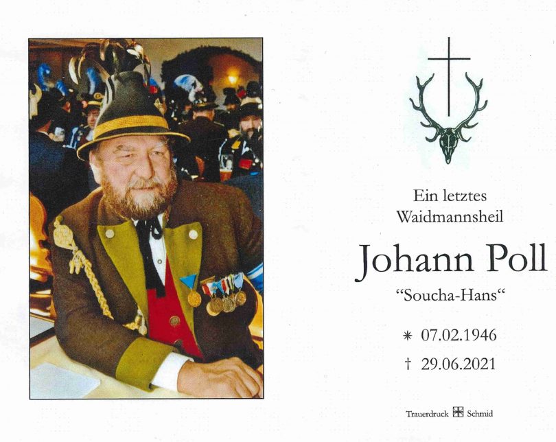Stille, hoffende Teilnahme, der um den Gesundheitszustand von Johann Poll Wissenden, begleitete den letzten Lebensweg des nun verstorbenen „Soucha-Hans“. Er verstarb im Kreise seiner Familie, Frau Agnes, drei Söhne und zwei Enkelkinder nur wenige Wochen nach der Diagnose einer nicht zu heilenden Krankheit. Eingebunden in das dörfliche Leben war sein Platz nie die erste Reihe, der Vordergrund, er war da, wenn man ihn brauchte, half wo es ging, übernahm Verantwortung, wo er gefragt wurde, so Bruder Rupert Poll im Rückblick auf das tätige Leben seines Bruders. Auf dem „Soucha“-Anwesen wuchs er mit Bruder und Schwester auf, unbekümmert im Umkreis einer intakten Natur. Diese Verbundenheit von einem langen Schulweg zu Fuß, einer unbeschwerten Jugend, der Militärzeit beim Hochgebirgszug, seiner Liebe zu den Bergen, zur Jagd sowie zu Tradition und Brauchtum bestimmten sein Leben, eingebunden im größer werdenden Familienverbund. Nach seiner Schulzeit erlernte er den Zimmererberuf, der ihnbis in den Rentenstand begleitete. Dank dieses handwerklichen Geschick schaffte er sich zusammen mit seiner Frau in Neuwöhr ein neues Zuhause, war eingebunden in die dortige Dorfgemeinschaft. Als Zimmerer war er beteiligt bei der Erstellung einer neuen Turmspitze in Altenbeuern sowie beim Bau des Gipflkreuzes auf dem Riesenberg bei der 25 Jahrfeier im Jahr 1989.