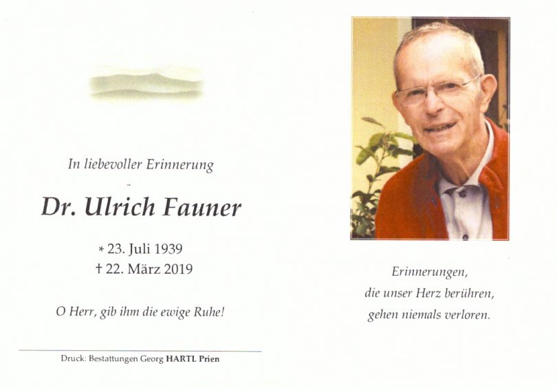 Eine überaus große Trauergemeinde nahm in der Pfarrkirche „Christkönig“ und auf dem Friedhof von Wildenwart Abschied von Dr. Ulrich Fauner, der im Alter von fast 80 Jahren verstarb. 30 Jahre hatte Dr. Fauner in Prien eine Hals-Nasen-Ohren-Praxis, seit 1977 lebte er mit seiner Familie in Mitterreith bei Frasdorf.
