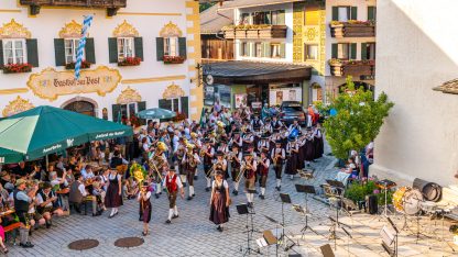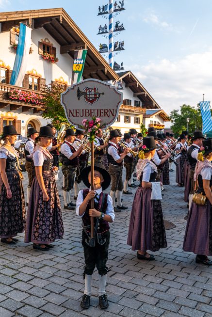 Für den Einmarsch auf den Dorfplatz wählten die Musikkapellen unterschiedliche Märsche. Die Musikkapelle Neubeuern unter Leitung von Bernd Eutermoser spielte “Castaldo”,  die Musikkapelle Rohrdorf unter Leitung von Christoph Danner spielte den Marsch “Wir grüßen mit Musik”, die Musikkapelle Nußdorf unter Leitung von Josef Maurer spielte den Marsch “Spielmannsgruß” und die Musikkapelle Samerberg unter Leitung von Benedikt Paul spielte “Kitzbühler Standschützen”.  Es folgte dann ein Platzkonzert aller vier Kapellen mit jeweils zwei Musikstücken. Höhepunkt bildete der Gemeinschaftschor aller vier Kapellen mit den Stücken “Musica Gloriosa”, “Highland Cathedral” und abschließend der Bayernhymne. Dem folgte der Musikantengruß.