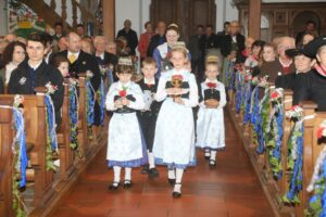 Die Trachtlerkinder trugen Wein und Brot zum Altar zusammen mit dem Geistlichen Pater Dan Anzorge