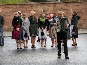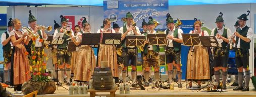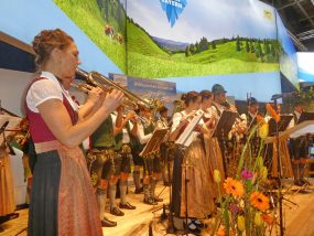 Großer Tag für Bernau a. Chiemsee in Berlin: mit drei voll besetzten Bussen machte sich die Gemeinde Bernau an einem stürmischen Tag auf den Weg in die Bundeshauptstadt. So spannend das Wetter die letztlich gelungene Anreise machte, war auch der erste Tag, der am frühen morgen mit der Eröffnung der Internationalen Grünen Woche in der Bayernhalle begann. Die Musikkapelle Bernau unter der Leitung von Georg Bauer hieß Bayerns Landwirtschaftsminister Helmut Brunner mit dem Bayerischen Defiliermarsch willkommen. Zwei Stunden lang präsentierten die 30 Blasmusikanten sowie die aktiven Dirndl und Buam der beiden Trachtenvereine „Almenrausch“ Hittenkirchen und „D´Staffestoana“ Bernau echtes bayerisches Brauchtum unter dem Berliner Funkturm. Besondere Aufmerksamkeit erzielten die Goaßlschnalzer aus beiden Vereinen, deren lautstarken Weisen waren über die Bayernhalle hinaus zu hören und lockten zusätzliche Besucher aus den Nachbar-Hallen an.