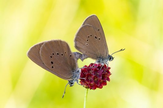 Sein Kollege Dirk Alfermann, Biologe und Gebietsbetreuer des Chiemsees, sieht das ähnlich: „Das ist ein starkes Zeichen für die hohe Wertigkeit extensiv genutzter Grünlandbestände. Denn dort kommt die Pflanze schwerpunktmäßig vor.“ Patrick Guderitz, seines Zeichens Vegetationsökologe, der sich intensiv mit schonend genutzten, feuchten Wiesen auseinandersetzt, schreibt dem Großen Wiesenknopf eine Indikator-Wirkung zu. „Wo der wächst hat man in der Regel auch für eine Vielzahl anderer Tier- und Pflanzenarten gute Lebensbedingungen. Man denke da nur an den Hellen und den Dunklen Wiesenknopf-Ameisenbläuling.“ Das sind Schmetterlinge die auf den Großen Wiesenknopf als Futter- und Raupenpflanze angewiesen sind. Sie stehen auf der Roten Liste der Tagfalter Bayerns.
