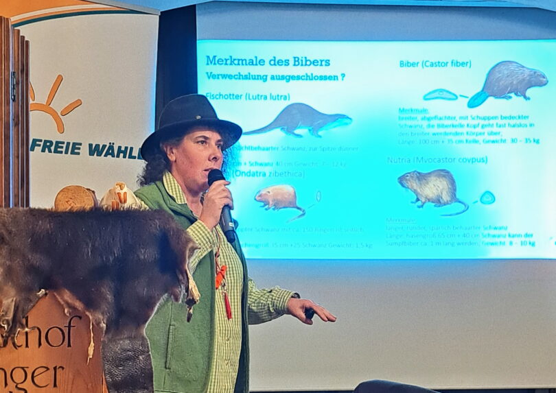Dritte Referentin des Abends war die Biberbeauftragte und Jägerin Nicole Anzinger-Bitsch aus dem Landkreis Freising. Sie ging ausführlich auf die Lebensweise und Herkunft der Biber ein, die einfach auch eine invasive Art seien. Auch den praxisgerechte Umgang mit dem streng geschützten Tier erläuterte sie. Sie betonte, das bei einer Überpopulation der Biber nicht nur Schäden an Eigentum Dritter entstehen, sondern auch die Biodiversität Schaden nimmt. In der anschließenden, teils emotionalen, Fragerunde, konnten sich die zahlreichen Geschädigten ihren Frust von der Seele reden und an die anwesenden Fachleuten ihre Fragen stellen.