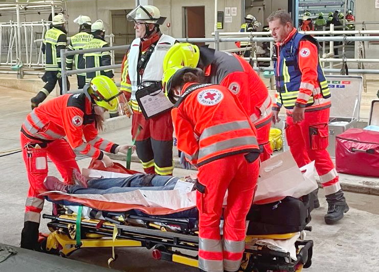 Schon kurz nach der Alarmierung trafen die ersten Einsatzkräfte der Feuerwehr und des Rettungsdienstes am simulierten Unglücksort ein. Vor Ort mussten Führungskräfte sich schnell einen Überblick verschaffen und ihre Maßnahmen aufeinander abstimmen. „Die Lebensrettung steht in dieser Phase an erster Stelle“, erläuterte Michaela Vornberger, Einsatzleiterin Rettungsdienst aus Rosenheim. Dabei kommt in Bayern zur Unterstützung der Rettungskräfte ein vorgegebener Algorithmus zum Einsatz – diese abgestimmte Vorsichtung war ein wesentlicher Bestandteil der Übung. Beteiligt daran war auch die Notaufnahme des Krankenhauses Agatharied. Das Team der Zentralen Notaufnahme bereitete sich mit zusätzlichen 30 Mitarbeitenden auf die Versorgung der Verletzten vor.
