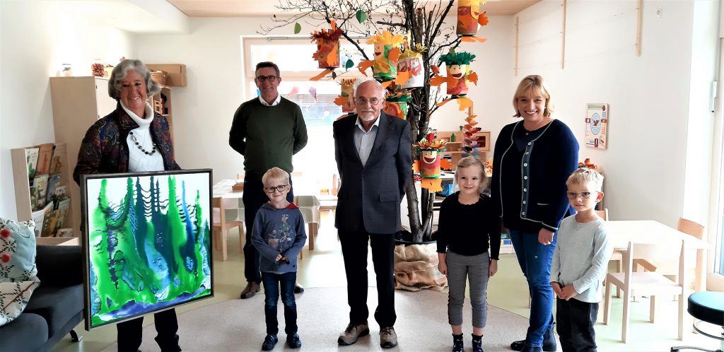 Foto: Unsere Aufnahme zeigt von links: Die Grainbacherin Ingrid Auer, die ein eigenes Bild an die Einrichtung spendete, sowie Bürgermeister Georg Huber, Max Kögel und die Kindergarten-Leiterin Andrea Paul.