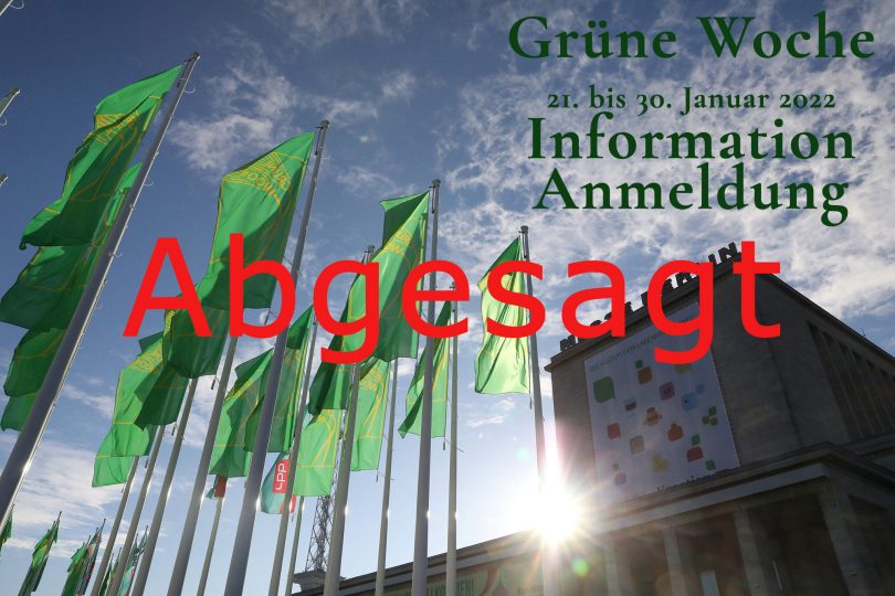 Die Internationale Grüne Woche 2022 (21. bis 30. Januar) findet nicht statt. Grund für die Absage sind die bundesweit steigenden Infektionszahlen im Kontext der 4. vierten Corona-Welle sowie die bestehenden und zu erwartenden Corona-Beschränkungen. „Die Internationale Grüne Woche lebt von den Begegnungen, vom Ausprobieren, Entdecken und Schmecken. Unter den gegebenen Voraussetzungen wie Masken und Abständen lassen sich die Erwartungen unserer Besucherinnen und Besucher an die Grüne Woche nicht erfüllen“, sagt Lars Jaeger, Projektleiter der Internationalen Grünen Woche bei der Messe Berlin.