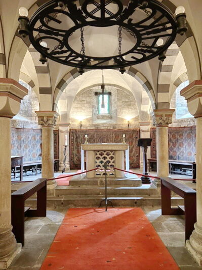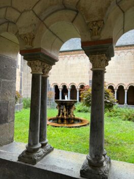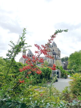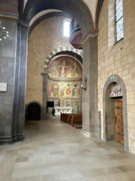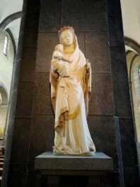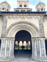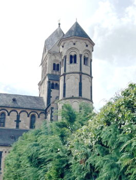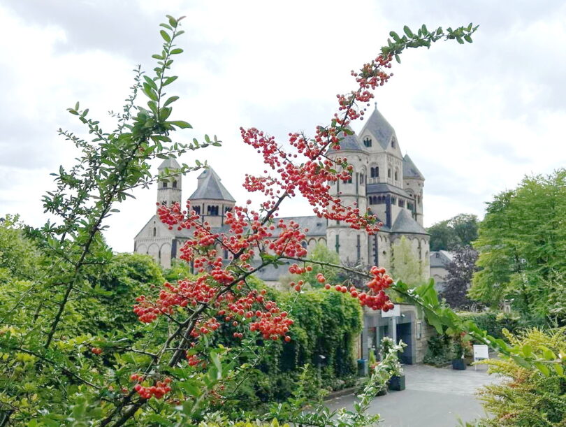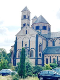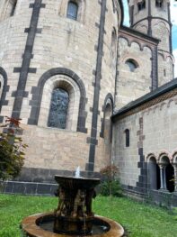 Die sechstürmige Klosterkirche, das Laacher Münster, gilt als eines der schönsten Denkmäler der romanischen Baukunst aus der Salierzeit in Deutschland. Das hier als „Paradies“ bezeichnete prächtige Atrium (im Kirchenbau für Vorhof) der gewölbten Pfeilerbasilika ist das letzte erhaltene nördlich der Alpen.[3][4] Der Kreuzgang aus dem Anfang des 13. Jahrhunderts wurde 1859 restauriert. 1926 verlieh Papst Pius XI. der Kirche den Ehrentitel einer „Basilica minor“.