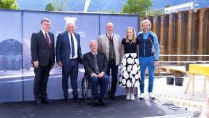 Zeremonie der Grundsteinlegung: v.l.n.r. Bayerischer Staatsminister für Bundesangelegenheiten und Medien – Dr. Florian Herrmann, Heiner Oberrauch – Präsident Oberalp Gruppe, Hajo Gruber – Bürgermeister Kiefersfelden, Bertram Brossardt – vbw Präsident, Ruth Oberrauch – Executive Board Mitglied und nächste Generation der Oberalp Gruppe, Benedikt Böhm – General Manager Dynafit (Foto: Oberalp)