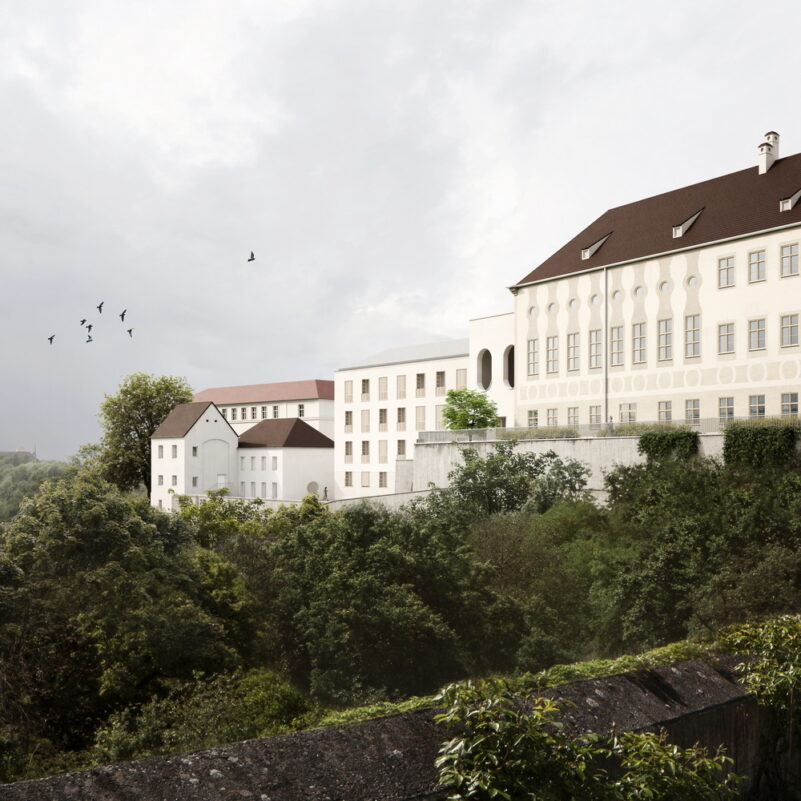Bericht: Erzbischöfliches Ordinariat – Fotos: Architekturbüro Bruno Fioretti Marquez – Ansicht des neuen Gästehauses und Blick von Weihenstephan auf den Domberg