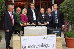 Ministerpräsident Dr. Markus Söder und Gesundheitsministerin Melanie Huml bei der Grundsteinlegung mit v.l.n.r. Bürgermeister der Stadt Wasserburg Michael Kölbl, Bezirkstagspräsident Josef Mederer, Geschäftsführer des kbo-Inn-Salzach-Klinikums Dr. Theodor Danzl, Stv. Landrat des Landkreises Rosenheim Josef Huber und Geschäftsführer der RoMed Kliniken Dr. Jens Deerberg-Wittram