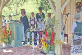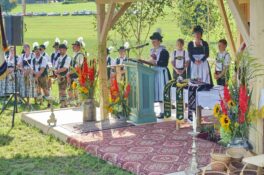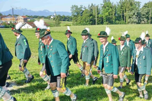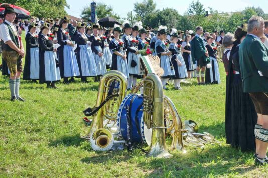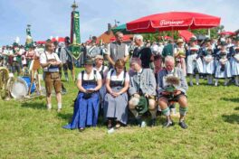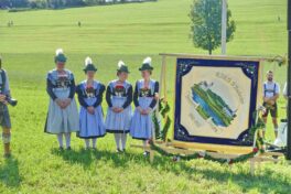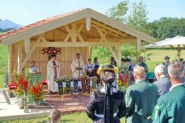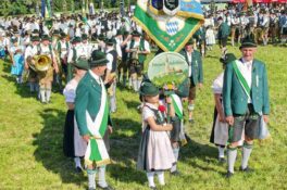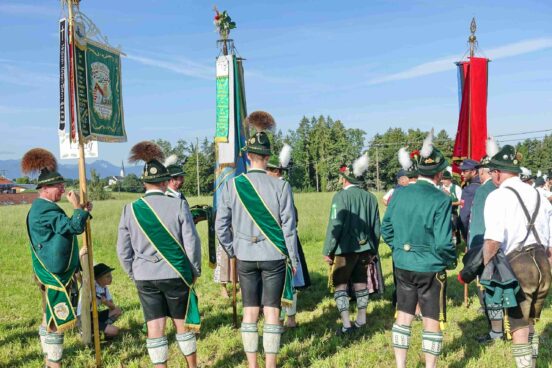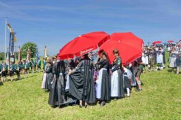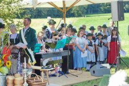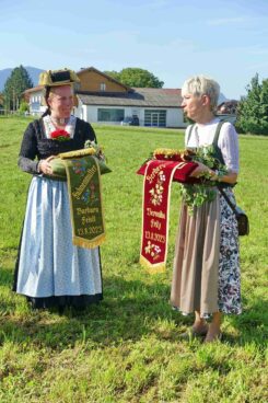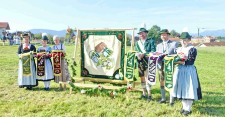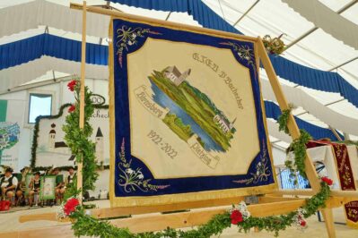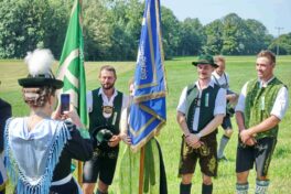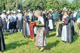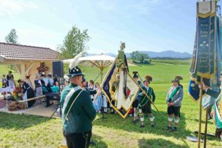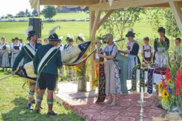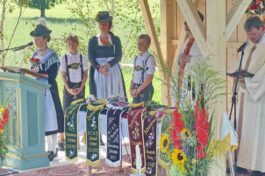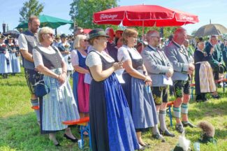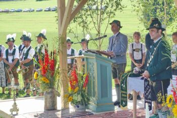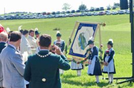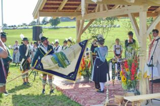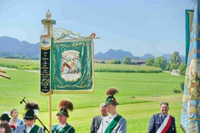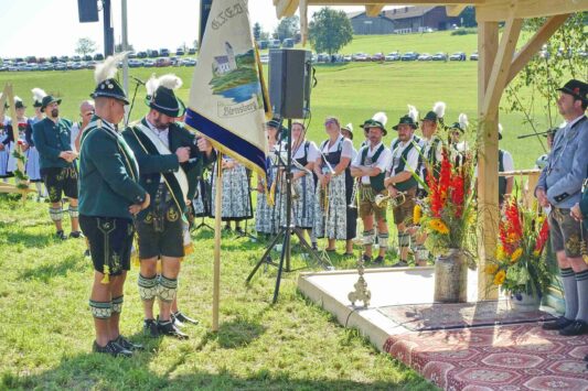 Zum Willkommen der Trachtler mit Altar- und Bergblick wies Pfarrer Kebinger auf den Geschichtsreichtum des Trachtenvereins hin, dessen einhundertjähriges Bestehen echter Anlass zu Dankbarkeit ist. Tobias Gaiser stellte die Jesus-Worte „Folget mir nach“ an den Anfang seiner Predigt und antwortete selbst mit Blick auf die neu geweihte Fahne mit der Aufschrift „Das Brauchtum schützend in die Zukunft tragen“ mit den Worten: „Das vom Obst- und Gartenbauverein schön gebundene Kreuz und die Fahne mögen den Weg von der Vergangenheit in die Zukunft weisen, bleiben wir traditionsverwurzelt und zukunftsoffen und leben und pflegen wir die christlichen Werte wirklich“. Erster Gauvorstand Michael Hauser (ebenso Ehrengast wie weitere Mitglieder der Vorstandschaft vom Gauverband I und wie stellvertretende Landrätin Marianne Loferer) bezeichnete im Beisein der Gaustandarte die neue Fahne als Zeichen der Kraft für eine neue Zeit und er ergänzte: „Veränderungen brauchen Standfestigkeit, das gilt für 100 Jahre Trachtenverein Hirnsberg-Pietzing ebenso wie für 140 Jahre Trachtenbewegung in Bayern. Gott mit Dir Du Land der Bayern“. Die Feier am Freialtar, der von Konrad Stein und seinen Helfern hergerichtet wurde, wurde mit der Bayernhymne beendet. Trachtenvorständin Katharina Stein war es ein großes Bedürfnis, ein vielfaches „Vergelt´s Gott“ zu sagen, denn Zusammenhelfen und Zusammenhalten wurden nicht nur an diesem Festtag groß geschrieben.