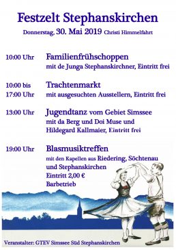 Der Trachtenverein “Simssee Süd” Stephanskirchen hat heuer am Feiertag Christi Himmelfahrt wieder ein Festzelt mit folgendem Programm: