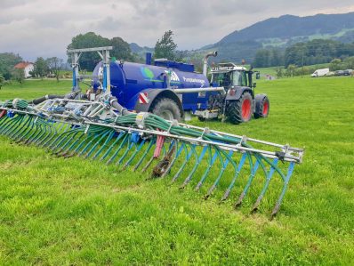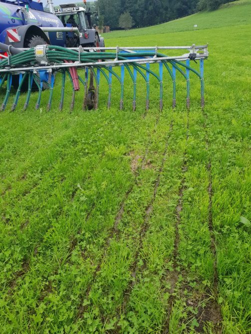 Die neue Düngeverordnung (DÜV) ist eine der aktuellen Herausforderungen für die heimische Landwirtschaft. Sie schreibt vor, dass Betriebe ab dem Jahr 2025 im Dauergrünland nur noch bodennah und emissionsarm ihre Gülle ausbringen dürfen, das heißt nur noch mit Schleppschuhverfahren oder mit Schlitztechnik. Ausnahmen von der DÜV wird es nur in Hanglagen und für Betriebe unter 15 Hektar geben. An drei Tagen und an verschiedenen Standorten präsentierten die Maschinenringe (MR) Bad Aibling und Rosenheim gemeinsam ein Gülle-Projekt und sie informierten anschaulich die unterschiedlichen Modelle – unter anderem auf dem Grieblhof in Achental in der Gemeinde Samerberg.