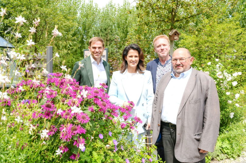 Bericht: Bayer. Landwirtschaftsministerium – Foto: Pia Regnet/StMELF zeigt Staatsministerin Michaela Kaniber gemeinsam mit Maximilian Böltl (MdL/1.v.li.), Stephan Keck (1. BM der Gemeinde Kirchheim/3.v.li.) sowie Gerhard Zäh (Vorsitzender der Bayerischen Landesgartenschau GmbH/4.v.li) auf der Landesgartenschau Kirchheim bei München.