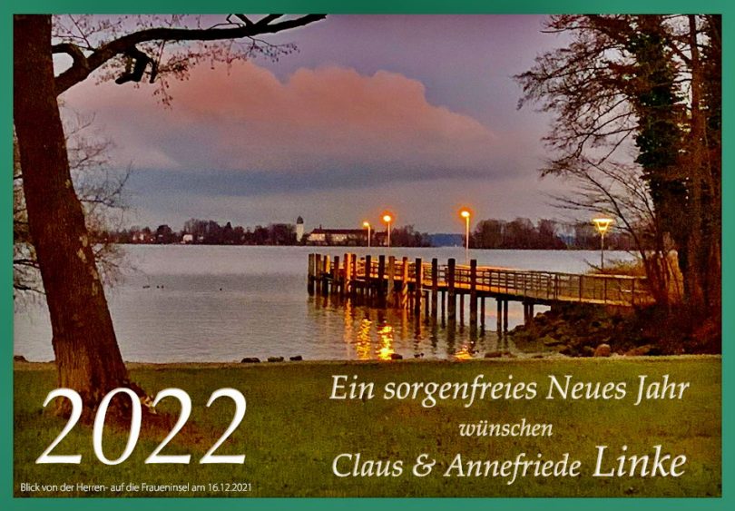 Foto und frohe Festtagswünsche von Claus Linke (claus.linke@terminwand.de) – Blick von Herren- auf Frauenchiemsee am 16. Dezember 2021