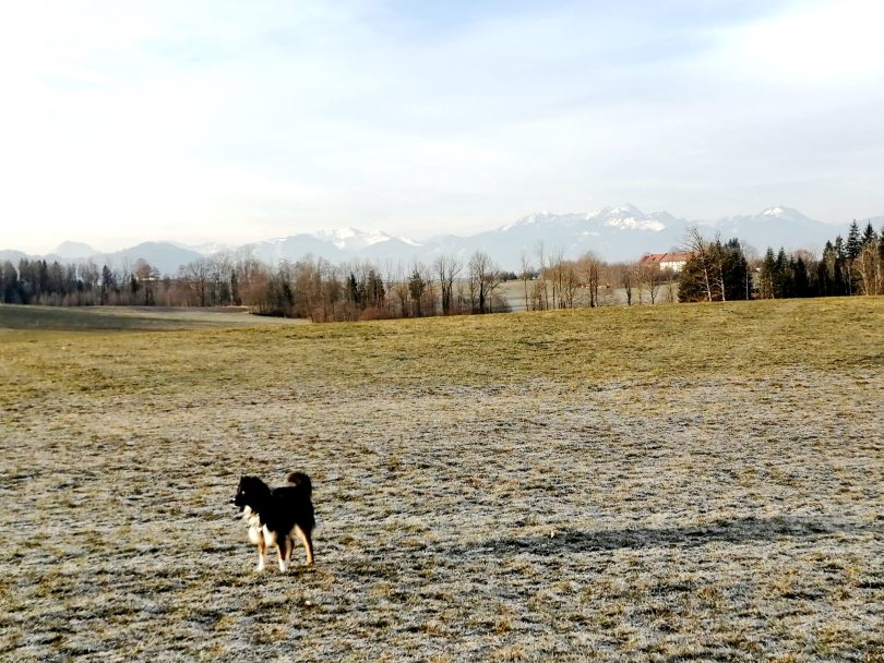 Gute Aussichten scheint Hund Mounty zu haben als er nach dem heutigen Sonnenaufgang sich mit seinem Frauchen auf dem Weg macht. Am liebsten macht er zu Ehren seines Namens Bergausflüge und kleine Herausforderungen, aber so ganz in der Früh hat er schon mal seine Bergwelt aus den Augen verloren und sozusagen hinter sich gelassen. Mit diesem Bild wünschen wir allen Leserinnen und Lesern einen guten Dienstag und fortan eine gute Woche.
