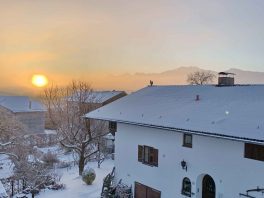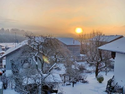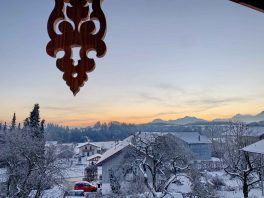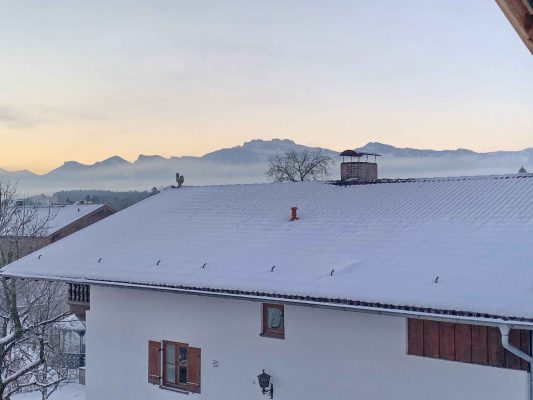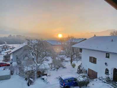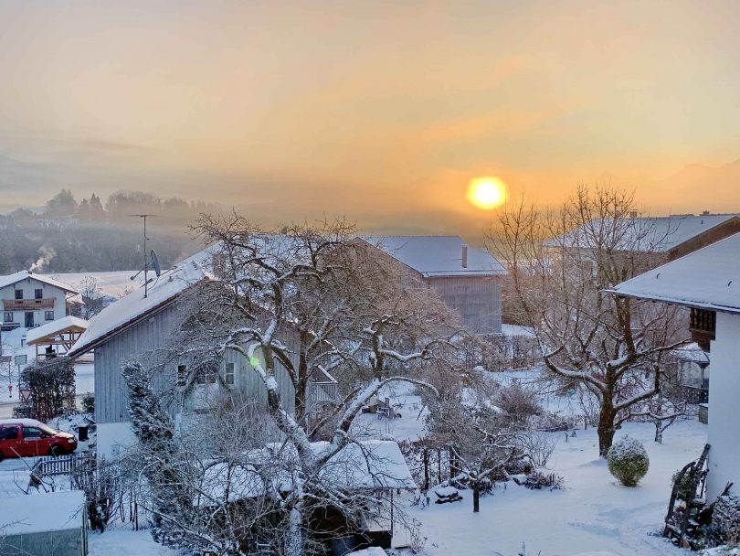 Mit einem beschaulichen Sonnenaufgang über dem Priener Ortsteil Prutdorf und mit Blick in die morgendliche Bergwelt lässt sich ein guter Tag und ein schönes Wochenende erwarten. Auch wenn keine großen und gemeinsamen Freizeitmaßnahmen derzeit angesagt sind, in Ruhe durch die Wege und Wälder des Chiemgaus zu spazieren ist allemal und auch alleine möglich.
