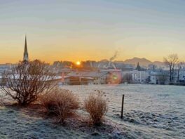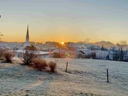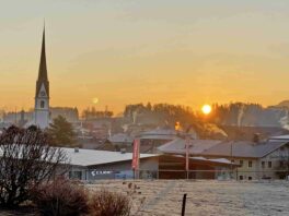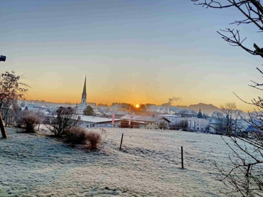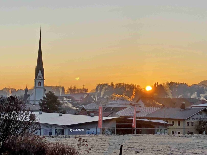 Ein paar Eindrücke von der Zeit des Aufgangs der Sonne über den Chiemgauer Bergen zeigen diese aktuellen Aufnahmen vom Ortsteil Bruck sowie vom Zentrum mit Heimatmuseum und Pfarrkirche.