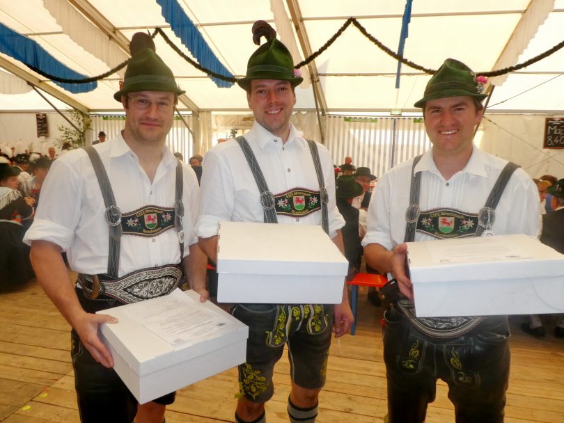 Trachtenfeste und Bierzelte haben ihre Anziehungskraft nicht nur wegen der guten Brotzeiten und Getränke von Grillküche und Bierschenke, sondern auch deswegen, weil es zu den Veranstaltungen auch Kaffee und Kuchen gibt. Um bei den großen Veranstaltungen genügend Kuchen und Torten anbieten zu können, ist es guter Brauch, dass sich die Trachtenvereine gegenseitig unterstützen und beliefern. So brachten diese drei Buam vom Trachtenverein Almenrausch Rossholzen die von ihren Frauen oder Müttern gemachten Köstlichkeiten zum Trachtenverein Prutting bei dessen Festwoche. Nunmehr dürfen sich die Rossholzener darüber freuen, dass auch ihnen was Gutes gebracht wird, denn am Dienstag, 14. August beginnen deren Festlichkeiten anlässlich des 120jährigen Gründungsfestes im Festzelt von Rossholzen. Das Fest dauert bis Montag, 20. August, alle Informationen zum Fest gibt es unter www.trachtenverein-rossholzen.de.