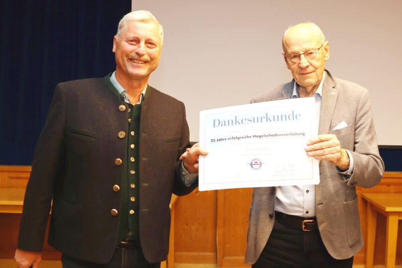 Bericht und Foto: LRA Rosenheim – Seit 25 Jahren unterstützt der Rosenheimer Hagelforschungsverein die Kolleginnen und Kollegen im benachbarten Kufstein. Mitbegründer des Hagelabwehr- und Forschungsvereins in Tirol, Prof. Walter J. Mayr (rechts) überreichte dem stellvertretenden Vorsitzenden Josef Bodmaier eine Urkunde als Dank.