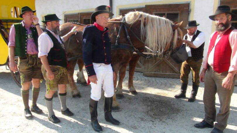 „Halbzeit ist!” – mit diesen Worten hat Michael Sattelberger seine Tour mit der Samerberger Postkutsche am Mittwochabend beschrieben. Gelandet waren sie in Aufkirchen bei Erding. Das ist ein kleines Dorf mit einer mächtigen Kirche, hoch oben am Kirchberg. Dort befindet sich ein Pferdegestüt, das direkt neben der Kirche sich für Reitsport anbietet. Drei Tage mit je 30 Kilometer Tagesetappe sind für die Pferde genug, weswegen sie nun ausgewechselt werden. Sie wurden abends auf einem Hänger bequem nach Samerberg zurückgebracht und durch zwei neue Pferde ersetzt.